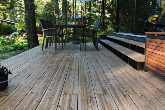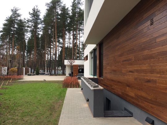 Экзотические породы, в частности, кумару и мербау — самый дорогой вариант отделки. Они наделены большой плотностью и твердостью. Находясь в постоянном контакте с влажной средой, обрели природную «суперсилу» в качестве устойчивости к гниению и расслоению. В то же время фасадная и террасная доска из экзотики склонна к деформации — плотная древесина, начиная искривляться, вырывает даже металлические крепежи. И, несмотря на то, что повышенная маслянистость экзотических пород наделяет их высокой плотностью, «тропический гость» иногда ведет себя непредсказуемо. Доска может почернеть, т.к. масла, которые содержатся в текстуре, не приспособлены для нашего климата.