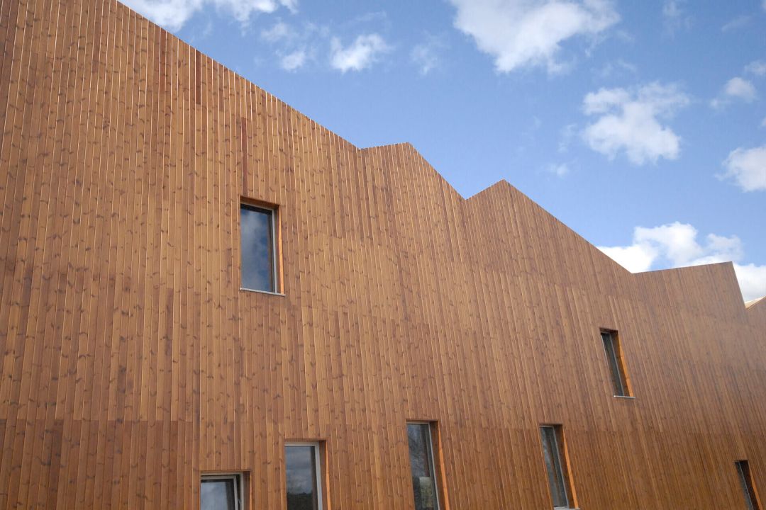 Красота термодревесины заключается в впечатляющем, деревенском и естественном внешнем виде. Он имеет красивое свечение и равномерный коричневый оттенок, который привносит теплоту природы в городское пространство.